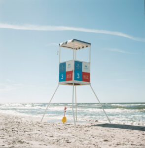 Fotografia analogowa. Opuszczona wieża wartownicza na plaży tuż po zejściu ratowników po zakończeniu sezonu. Wykonana aparatem Hasselblad 500 c/m na kliszy Kodak. Skanowana profesjonalnym skanerem Epson V800 Photo w rozdzielczości 3200 DPI.